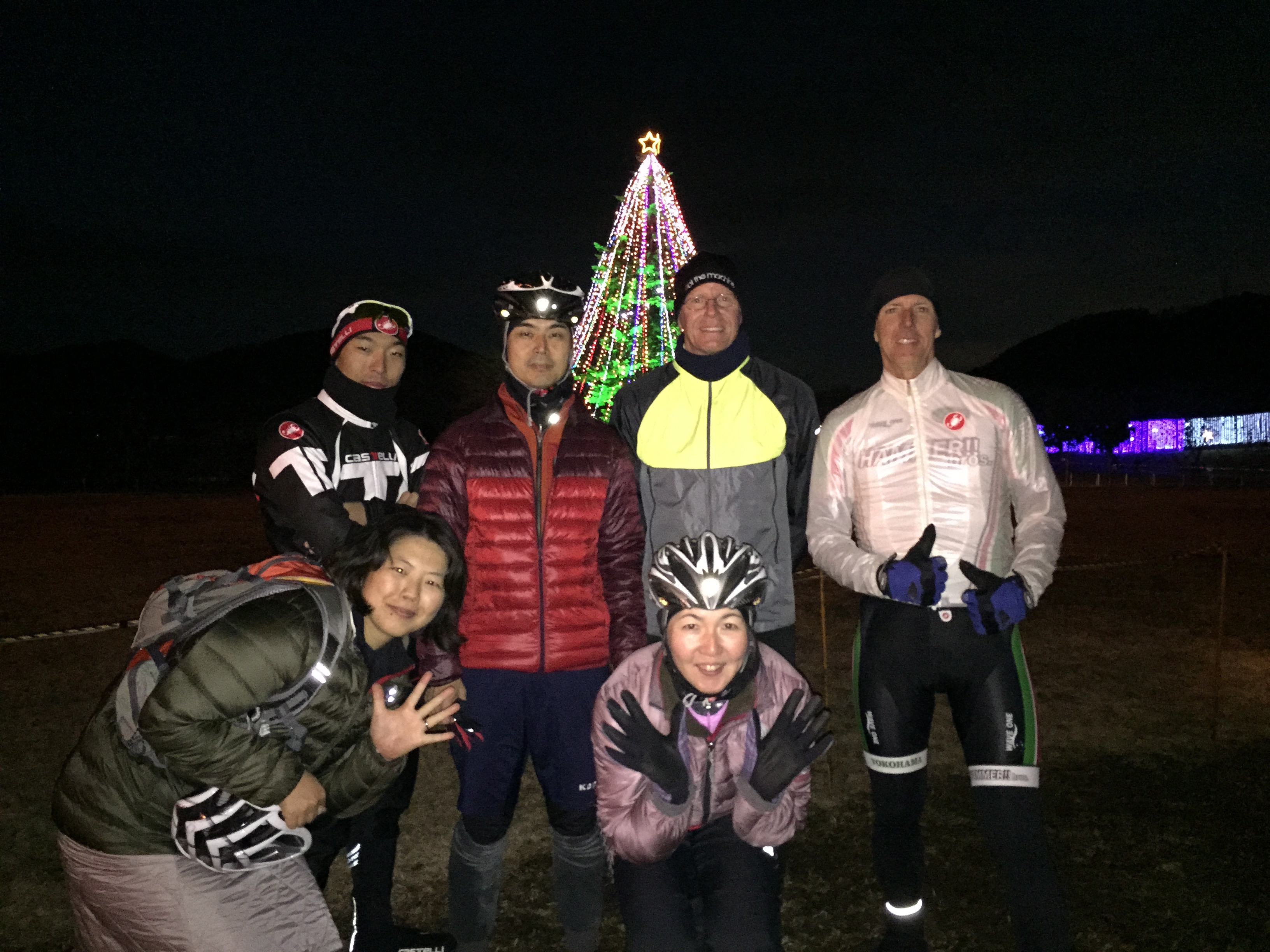 ジャンボツリー発祥と言われているジャンボクリスマスツリーのライトアップをバックにみんなで記念撮影!