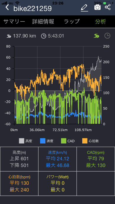 サイコンには表示されないのでパワータップのアプリをスマートフォンに入れて記録。