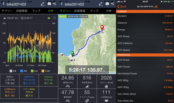 札幌についたころの疲労感はかなりいいかと感じました、改めて心拍のデータを見るともう少し踏めたなと。
