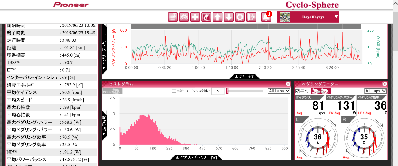 疲労で高強度が出ないが、数回スプリント。体の動かし方(腕の角度とか)を多少意識。Maxパワーは968w、1000wは最低出したい