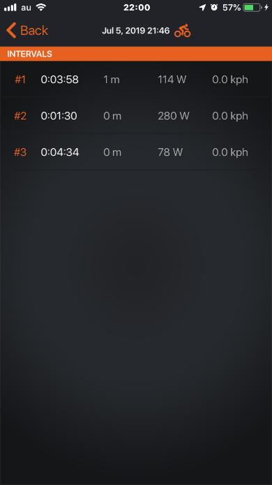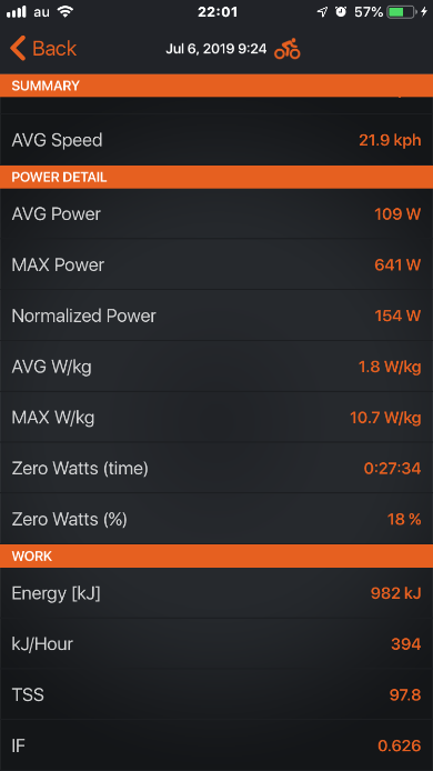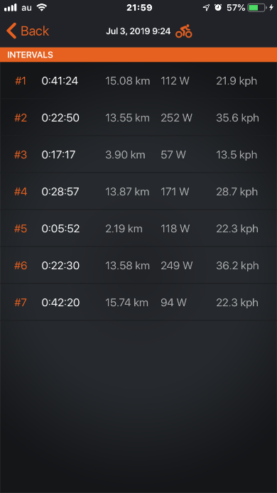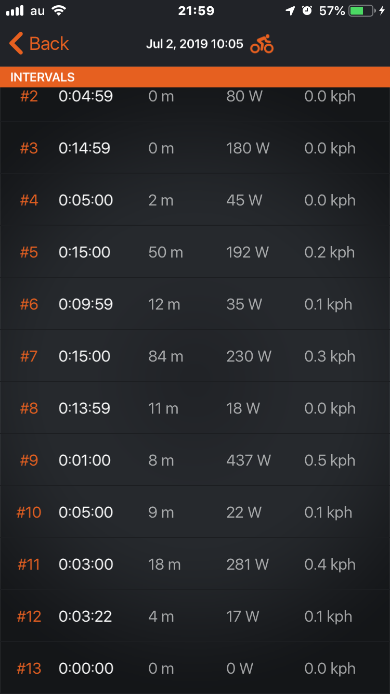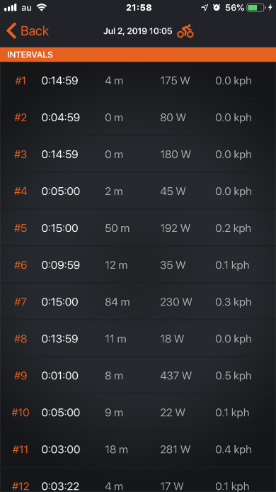 TTポジションの確認やペダリングの練習などを行い、20分走を行いました。途中で間違ってラップボタンを押してしまい、17分と3分に分かれています。ニセコのTTを意識して20分で設定しました。