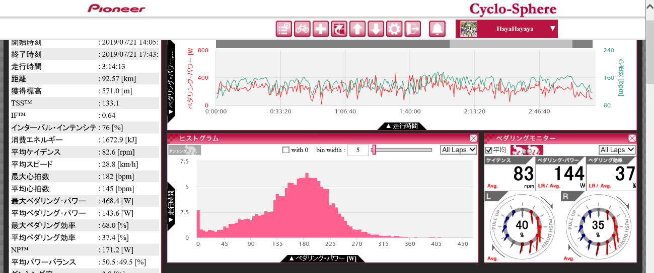 最初の十国峠(345W/3m30s)はアウターで、かなりキツかった割にタイムはベストより10秒遅い。